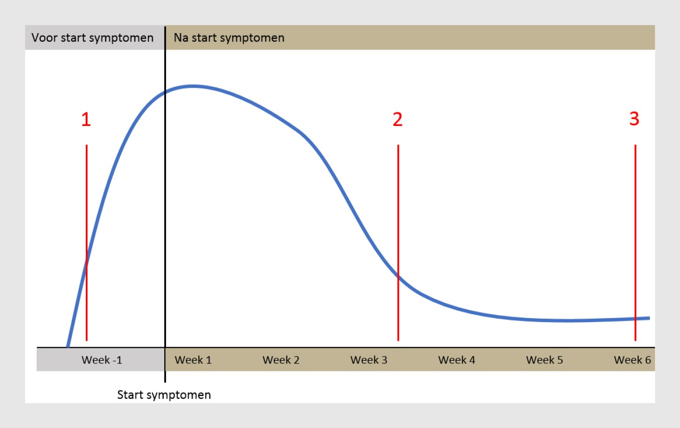Na zo’n 60.000 testen zagen we bij ongeveer een kwart van de positieve testuitslagen (400 van bijna 1600) een Ct-waarde > 35 bij één of meerdere targets. De kans op zo’n uitslag is natuurlijk kleiner wanneer niet op 3 maar op 2 targets getest wordt, zoals veel laboratoria doen. Zwak positieve testuitslagen kunnen in werkelijkheid fout-positief zijn, maar ze kunnen ook passen bij een vroege of doorgemaakte infectie (zie de figuur). Om dan de uitslag juist te kunnen interpreteren, heb je aanvullende informatie van de patiënt nodig. Bij een vroege infectie zal de patiënt waarschijnlijk nog besmettelijk worden en adviseren we om de test te herhalen. In de andere gevallen is de patiënt mogelijk niet infectieus. Technisch gezien gaat het dan niet om fout-positieve uitslagen, maar als patiënten niet meer besmettelijk zijn verdwijnt de noodzaak voor isolatie van de indexpatiënt en quarantaine van zijn of haar contacten.