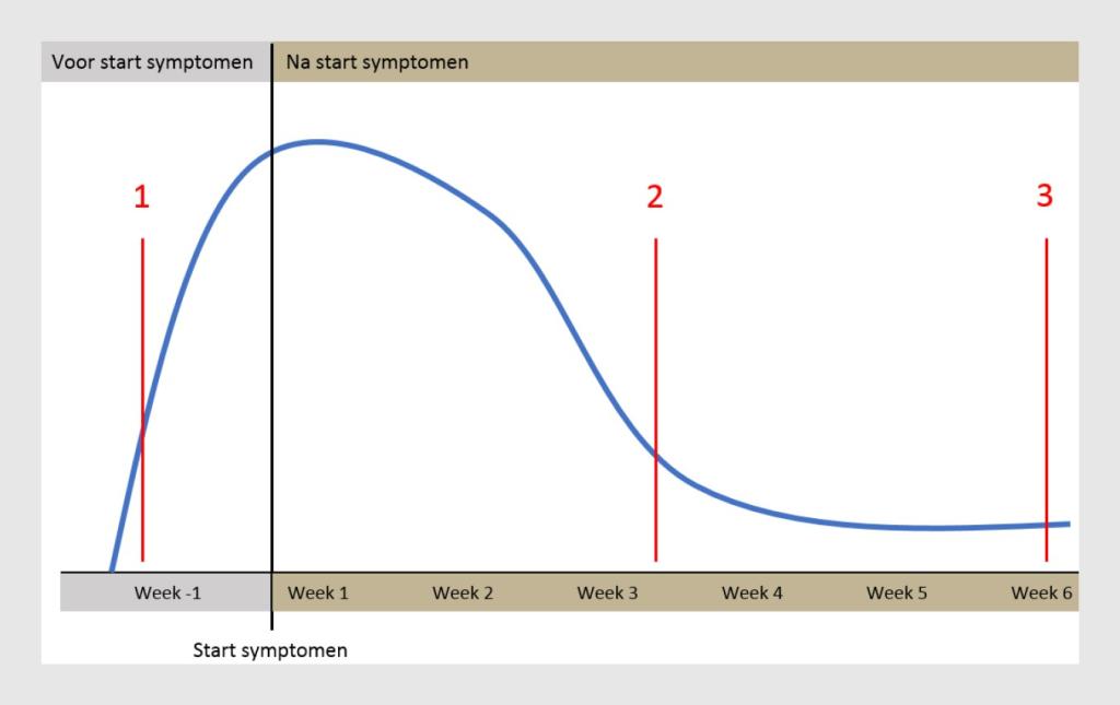 De Ct-waarde zegt dus iets over de hoeveelheid RNA in het onderzochte materiaal: een lage Ct-waarde betekent veel viraal RNA, een hoge waarde duidt op weinig viraal RNA. Om die reden hangt de Ct-waarde af van hoeveel virus er in de keel zit en hoeveel daarvan op de wattenstaaf terechtkomt. Dat laatste wordt bepaald door de manier waarop het materiaal wordt afgenomen en vervolgens verwerkt wordt. Hoeveel virus er in de keel zit is afhankelijk van het ziektestadium: na transmissie gaat het virus zich repliceren en neemt de virusconcentratie (‘viral load’) toe, en zodra het afweersysteem de infectie onder controle krijgt neemt de virusconcentratie weer af (figuur). Het rest-RNA van het virus kan nog lang detecteerbaar blijven.