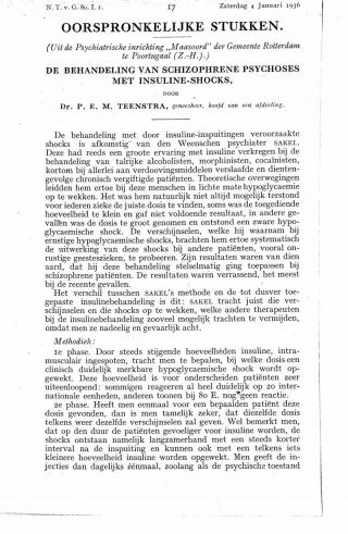 Dit artikel is alleen beschikbaar als PDF.Lees de PDF Artikelinformatie Online verschenen op 7 januari 1936 Citeer dit artikel als Ned Tijdschr Geneeskd. 1936;80:17-7 Heb je nog vragen na het lezen van dit artikel? Check onze AI-tool en verbaas je over de antwoorden. ASK NTVG Ook interessant Nieuws Een openbare vermaning aangaande de behandeling van schizophrenie met insuline-shock Nieuws Insuline-shock Overig De behandeling van schizophrene psychoses met insuline en cardiazol Meer gerelateerd … Reacties Login om een reactie te plaatsen