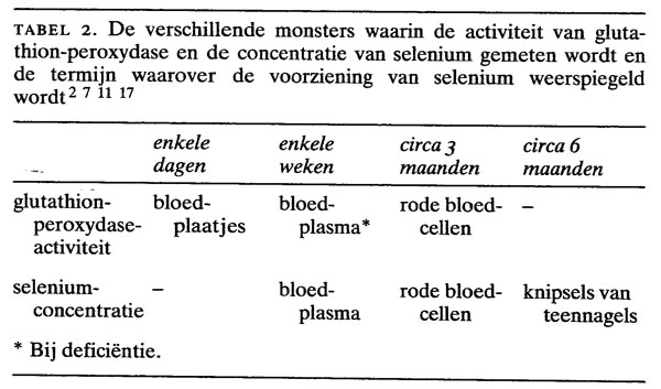 Het menselijk lichaam bevat circa 6-20 mg Se, waarvan circa de helft zich in het spierweefsel bevindt. De concentratie is het hoogst in de niercortex, daarna in de lever en is het laagst in spierweefsel.17-19 Voor de bepaling van de Se-voorziening is momenteel één functionele graadmeter bekend, namelijk de activiteit van glutathion-peroxydase. Daarnaast wordt veelal de Se-concentratie in diverse biologische monsters gemeten. Tabel 2 geeft enige kenmerken van deze bepalingen.