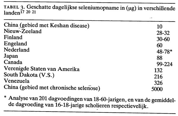 In tabel 3 is de geschatte inneming van selenium in verschillende landen weergegeven. De dagelijkse inneming in Nederland bevindt zich in een vrij laag gebied, aan de ondergrens van de (in de V.S.) aanbevolen hoeveelheid van 50-200 µg.1 Uit een recent onderzoek naar de Se-gehalten in het serum van inwoners van 10 Westeuropese landen bleek echter dat Nederland zich niet behoeft te rekenen tot de seleniumarme gebieden.22