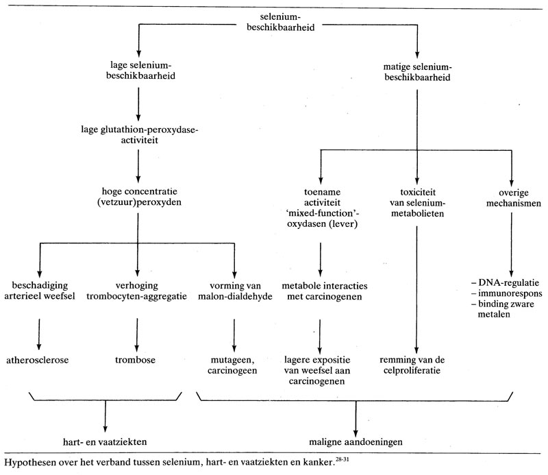 Er is een lange lijst van ziekten die mogelijk met selenium in verband staan.15 Voor twee hiervan, hart- en vaatziekten en kanker, staan enige gepostuleerde werkingsmechanismen in de figuur samengevat. De relevantie van Se bij hart- en vaatziekten is echter in epidemiologische onderzoekingen allerminst duidelijk.32 Wat de rol van Se betreft bij het ontstaan van kanker, moet worden opgemerkt dat in de vele dierexperimenten die zijn uitgevoerd, de beschermende werking werd gevonden bij relatief hoge doses, meestal met Se in de vorm van seleniet.33 Hierdoor is de betekenis van deze experimenten voor de voeding van de mens niet geheel duidelijk. Prospectieve epidemiologische onderzoekingen in de V.S. en in Finland lijken consistent met de vermoedelijk beschermende werking van Se, doch zijn niet overtuigend.34