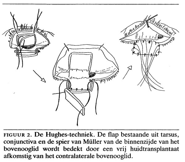 Voor het sluiten van het defect na de excisie werd naast primaire sluiting gebruik gemaakt van de Hughes-techniek, de Tenzel-techniek en de glabella-flap (figuur 2,3 en4). Bij de Hughes-techniek werd een flap van de binnenzijde van het bovenooglid, bestaande uit tarsus, conjunctiva en de spier van Müller, in het defect van het onderooglid gehecht. Dit werd bedekt met een vrij huidtransplantaat, afkomstig van het contralaterale bovenooglid. Na enige weken werd de flap enkele millimeters boven de onderooglidrand doorgesneden, waarna er weer twee goed functionerende oogleden ontstonden.