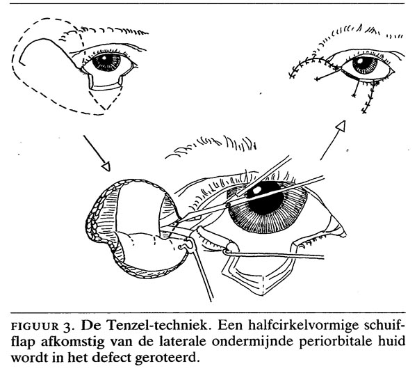 De Tenzel-flap zoals getekend en beschreven is géén Tenzel-flap. De door Tenzel beschreven flap is een schuifflap, die de orbitagrens niet overschrijdt. Sluiting van het defect treedt op door ‘stretch’ van de geïncideerde huid. De flap wordt dus ook niet in het defect ‘geroteerd’. Beschreven is iets tussen een Tenzel-flap en een klassieke wang-rotatieflap.