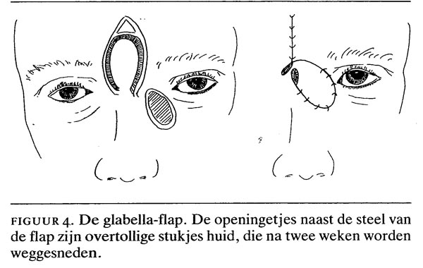 De glabella-flap werd gebruikt om defecten ter plaatse van de mediale ooghoek te sluiten. Tussen de beide wenkbrauwen werd een V-vormige incisie gemaakt. De flap werd ondermijnd terwijl het brede gedeelte bleef vastzitten aan de neusbrug. De 2 benen van de V werden vervolgens aan elkaar gehecht, waarna de flap in het defect werd geschoven en werd vastgehecht. Na 14 dagen werd de overtollige huid verwijderd en zo werd een kosmetisch acceptabele mediale canthus verkregen.