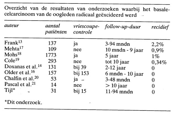Ons onderzoek bij 31 patiënten met een basale-celcarcinoom van de oogleden liet een uitstekend resultaat zien na radicale excisie: de functionele en kosmetische resultaten waren goed en er traden geen recidieven op. Hoewel onze groep patiënten beperkt was, wijst een overzicht van de literatuur in dezelfde richting (tabel). In het onderzoek van Frank traden 3 recidieven (2,2) op, maar hier zou ook sprake kunnen zijn geweest van het ontstaan van een nieuwe tumor.13 Mehta vond één recidief (0,34) na 10 maanden.17 Mohs beschrijft een recidiefpercentage van 1 bij 1773 patiënten, terwijl hij veel gecompliceerde gevallen behandelde.18 Cole vond één recidief, maar dit was waarschijnlijk het gevolg van onervarenheid van de chirurg.19 In de andere onderzoeken werden geen recidieven aangetroffen.14162021 Uit deze cijfers blijkt duidelijk de betrouwbaarheid van deze behandelingsmethode.