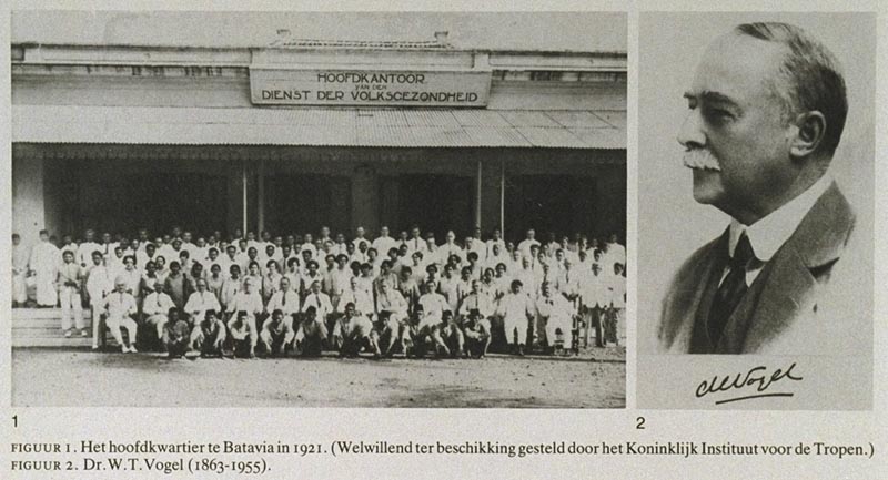 In tegenstelling tot het moederland, waar het geneeskundige staatstoezicht uitsluitend een controlerende taak had, was de BGD dus ook belast met de uitvoering van maatregelen ter bevordering der volksgezondheid. Het hoofdkwartier van deze ambtelijk-hiërarchisch georganiseerde dienst was in Batavia gevestigd (figuur 1). Het was dr.W.T.Vogel, van 1913 tot 1921 hoofdinspecteur van die dienst, die ‘de Burgerlijke Geneeskundige Regeeringsdiensten en -inrichtingen ineensmeedde tot een geweldig organisch geheel, dat in den aanvang van wetenschappelijken zin doordrenkt was’ (figuur 2).3 Het accent kwam te liggen op de bestrijding van de volks- en besmettelijke ziekten, eerder dan op individuele ziekenbehandeling. Aan de individuele zorg viel in dat onmetelijke land met – in 1930 – een bevolking van 62 miljoen verspreid over honderden eilanden, niet te denken met het handjevol artsen waarover de dienst vooral in de aanvang slechts kon beschikken. Het hygiënische beginsel kwam tot uitdrukking door de naamsverandering die de dienst in 1920 onderging tot Dienst der Volksgezondheid (DVG).