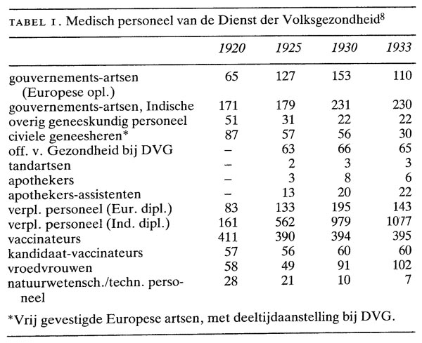 De verzelfstandiging hield vooreerst geen toeneming van het aantal beschikbare artsen in, zodat naast de civiele geneesheren met inbegrip van de Indische artsen – abituriënten der STOVIA – de officieren van gezondheid met werkzaamheden ten behoeve van de DVG bleven belast. Tot aan de Japanse inval is dat voor de Buitengewesten – de eilanden buiten Java – grotendeels zo gebleven. Tabel 1 geeft een overzicht van het DVG-personeel in de jaren twintig en in de beginjaren van het daaropvolgende decennium. In weer latere jaren nam het aantal artsen snel toe totdat het in 1940 ongeveer 1400 bedroeg voor geheel Indonesië, met inbegrip van zendings- en missieartsen en artsen in dienst van cultuurondernemingen.4