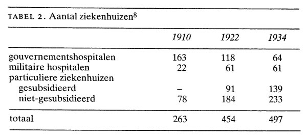 Het uitgangspunt dat de arbeid van de DVG vooral hygiënisch-preventief zou zijn, betekende niet dat het Gouvernement, vertegenwoordig door deze dienst, zelf geen ziekenhuizen zou exploiteren. Over de gehele archipel verspreid waren er ziekenhuizen in verschillende categorieën: Centrale Burgerlijke Ziekeninrichtingen in de grote steden op Java, Burgerlijke Ziekeninrichtingen in kleinere plaatsen, en poliklinieken. Tabel 2 illustreert de toeneming van het totale aantal ziekenhuizen in een periode van 25 jaar.