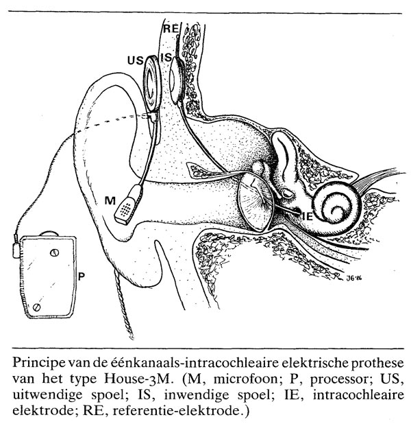 Toen in het begin van de jaren zeventig begonnen werd om op systematische wijze bij totaal doven een elektrische binnenoorprothese (‘cochlear implant’) te implanteren, ondervond dit zeer veel kritiek. De meeste fysiologen beschouwden deze stap als zinloos en daarom onverantwoord. ‘All that would be produced would be a noise’, zoals één van hen verklaarde in een discussie met de gangmaker William House te Los Angeles. House begon met een éénkanaalssysteem met een intracochleair aangebrachte elektrode waarmee intact gebleven zenuwvezels gestimuleerd werden. De apparatuur bestond uit: (1) een microfoon, (2) een processor waarin geluid (zoals spraak) omgezet wordt in een elektrisch signaal, (3) een uitwendige zendspoel en inwendig aangebrachte ontvangstspoel die magnetisch ten opzichte van elkaar in positie worden gehouden en (4) een éénkanaals-elektrode die via het ronde venster 6 mm in de cochlea werd gevoerd (figuur).