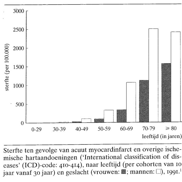 De ‘achterstand’ van jonge vrouwen ten opzichte van mannen wat betreft de sterfte aan ischemische hartziekten wordt gedeeltelijk ingehaald tijdens het ouder worden (figuur). In 1992 stierven in Nederland meer vrouwen (26.725) dan mannen (25.478) aan hart- en vaatziekten.2 De derde emancipatie (vrouwen krijgen dezelfde ziekten als mannen) lijkt in volle gang.3 Dat werkt door in het wetenschappelijk onderzoek: dit richt zich onder andere op verschillen tussen vrouwen en mannen wat betreft oorzaak, incidentie, diagnostiek en behandeling van hart- en vaatziekten. Hieruit blijkt onder meer dat coronaire hartziekten bij vrouwen minder agressief worden behandeld dan bij mannen.4 Er bestaat veel wetenschappelijke belangstelling voor de invloed van hormonen en van de menopauze op het ontstaan van ischemische ziekten. De meeste aandacht is echter momenteel geconcentreerd op de effecten van hormonale substitutietherapie, terwijl de rol van endogene hormonen in de pathofysiologie…