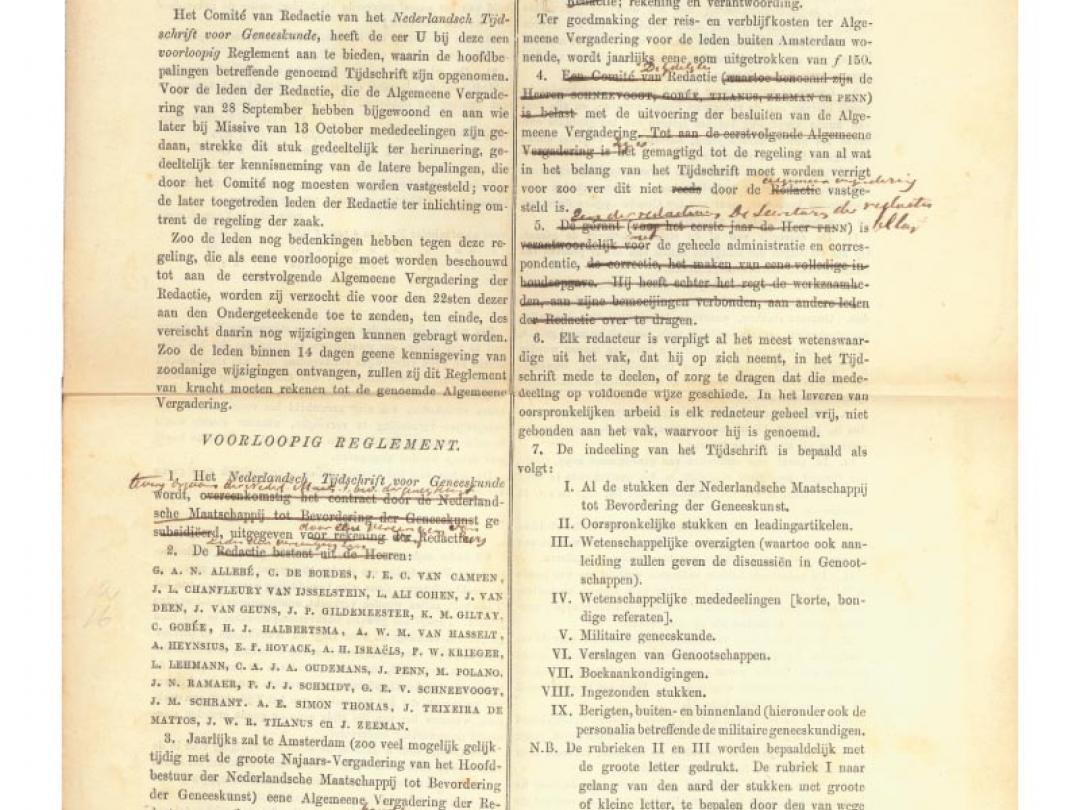 Op zondag 28 september 1856, dit jaar 150 jaar geleden, werd in Amsterdam een vergadering gehouden waarop het Nederlandsch Tijdschrift voor Geneeskunde werd opgericht. Voor dat gegeven zijn er opvallend weinig bronnen. Dit jaar verschijnt de 150e jaargang van het Tijdschrift. Vanwege het aankomende jubileum werden oude stukken, die bij de verhuizing in 1992 van de Jan Luykenstraat naar de Johannes Vermeerstraat apart waren gelegd, nog eens tevoorschijn gehaald. In een bundel ingebonden vergaderingsverslagen uit de begintijd werd, verscholen in een insteekmapje binnen de voorkaft, een gedrukt ‘voorloopig Reglement’ aangetroffen. Daarin wordt de oprichtingsdatum 28 september genoemd. Op dit ‘voorlopig Reglement’ staan in het handschrift van J.Zeeman, hoofdredacteur in de periode 1867-1883, met pen enkele opmerkingen. Onder meer streept hij door dat het Tijdschrift zal worden uitgegeven ‘voor rekening der Redactie’ en verandert dat in ‘door een Vereeniging van Redacteurs’. Dit document geeft inzicht in de introductie van de Vereniging van redacteuren, die nu nog steeds het Tijdschrift uitgeeft.