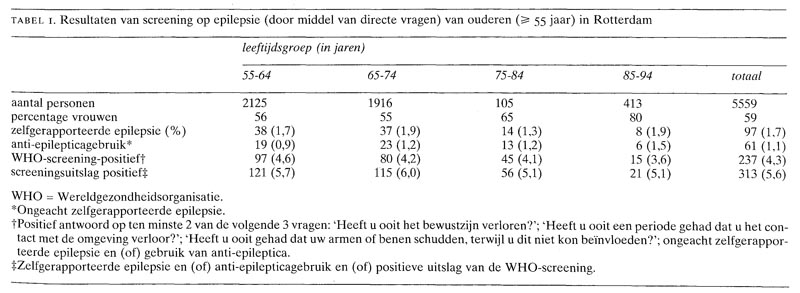 De screening op epilepsie werd uitgevoerd als onderdeel van het ‘Erasmus Rotterdam gezondheid en ouderen’ (ERGO)-onderzoek, vanaf juni 1991. Teneinde stabiele prevalentieschattingen te verkrijgen, werden personen van 95 jaar en ouder buiten beschouwing gelaten. Van de in aanmerking komende 7081 personen namen er 5559 (79) deel. Screening vond plaats met directe vragen naar epilepsie en medicatiegebruik, en met de relevante vragen uit het protocol van de Wereldgezondheidsorganisatie voor onderzoek naar neurologische ziekten. Verificatie en bevestiging van de diagnose vond plaats door een onderzoeksarts en vier epileptologen. Classificatie van de epilepsie geschiedde volgens de International League Against Epilepsy.