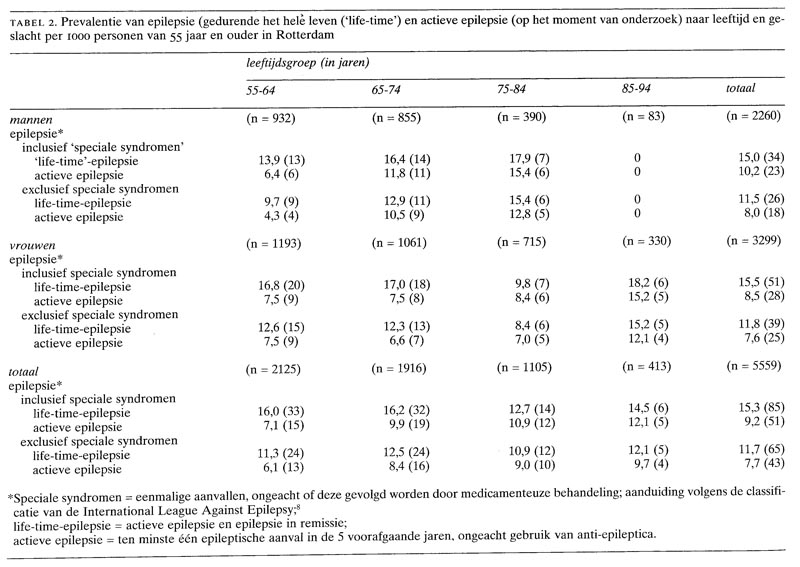 In totaal werd bij 85 van de bij de screening positief bevonden personen de diagnose ‘epilepsie’ bevestigd door nader onderzoek (27). De prevalentiecijfers voor epilepsie staan in tabel 2. Wij vonden in deze populatie van 55- tot 95-jarigen een life-time-prevalentie van 15,3 per 1000 en een prevalentie van actieve epilepsie van 9,2 per 1000 personen, inclusief de speciale syndromen. Als personen met speciale syndromen niet werden meegeteld, waren deze cijfers respectievelijk 1,7 en 7,7 per 1000. De prevalentie van actieve epilepsie nam toe met de leeftijd, maar de prevalentie van life-time-epilepsie nam niet toe in de hoogste leeftijdsgroepen.
