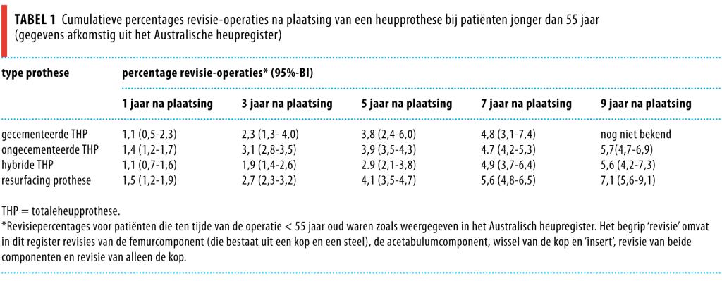 Voor patiënten van alle leeftijden laat het Engelse heupregister het laagste revisiepercentage na 5 jaar zien bij patiënten die een gecementeerde THP hadden gekregen, namelijk 2,0 % (95%-BI: 1,8-2,1).7 Voor een ongecementeerde THP was dit 2,7% (95%-BI: 2,4-3,0), voor een hybride prothese 3,4% (95%-BI: 3,2-3,7) en voor een resurfacing prothese 6,3% (95%-BI: 5,7-7,0).7 Het hoogste faalpercentage werd gezien na plaatsing van een metaal-op-metaal THP met een grote kop (‘large head metal-on-metal’ (LHMoM)), namelijk 7,8% (95%-BI: 6,6-9,3).7 Er zijn overigens grote verschillen in de revisiepercentages tussen de verschillende merken resurfacing prothesen (tabel 3).