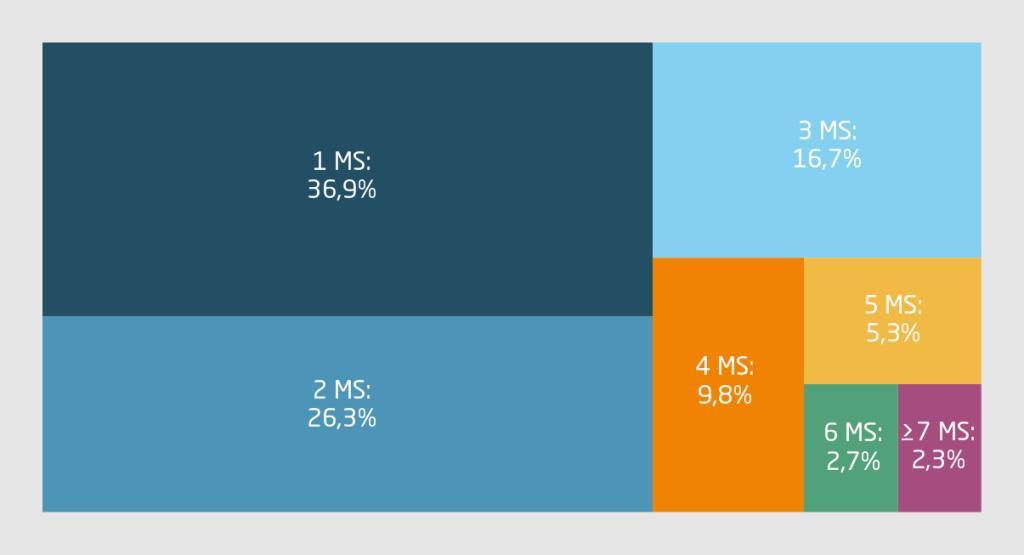Tegeldiagram van het aantal medisch specialismen (MS) dat een patiënt met diabetes in een jaar bezoekt