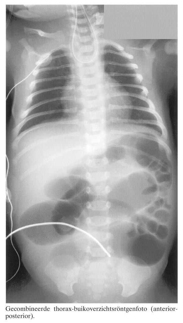 Een aterm geboren mannelijke neonatus werd postnataal naar ons ziekenhuis overgeplaatst in verband met ‘bellenblazen’ en omdat het opvoeren van een maagsonde bij hem niet mogelijk was. Bij lichamelijk onderzoek viel op dat het kind uiterlijke kenmerken had van het syndroom van Down. Omdat een oesofagusatresie werd vermoed, werd een gecombineerde thorax-buikoverzichtsröntgenfoto gemaakt (figuur). Hierop was te zien dat de maagsonde opkrulde in de oesofagus en dat er lucht was in de darmen, hetgeen de diagnose ‘oesofagusatresie met distale tracheo-oesofageale verbinding’ bevestigde. Opvallend was dat er 11 paar ribben waren. Dit versterkte in röntgenologisch opzicht het klinische…
