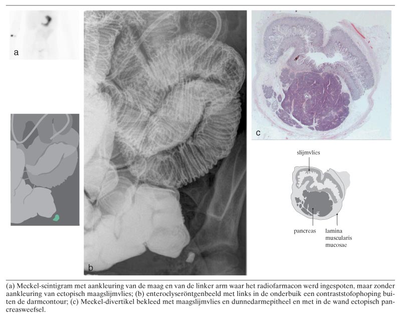 Een jongen van 11 jaar met een blanco voorgeschiedenis werd wegens ernstig rectaal bloedverlies (Hb-daling tot 3,5 mmol/l) doorverwezen voor endoscopie. Meckel-scintigrafie (waarbij met radioactief technetium functionerend (ectopisch) maagslijmvlies wordt afgebeeld) gaf geen hotspot te zien als teken van een Meckel-divertikel. Differentiaaldiagnostisch werd gedacht aan een poliep, een vaatmalformatie, Henoch-Schönlein-purpura, teleangiëctasieën of toch een Meckel-divertikel. Bij gastroduodeno- en bij coloscopie werden geen slijmvliesafwijkingen gezien; wel kwam er rood bloed uit het terminale ileum. Biopten van oesofagus, maag, duodenum, ileum en colon hadden normaal slijmvlies. Opnieuw gaf Meckel-scintigrafie een negatief beeld (figuur a). Omdat patiënt nog enkele malen…