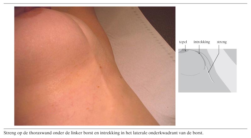 Een gezonde 35-jarige vrouw werd verwezen wegens een al twee weken bestaande pijnlijke streng onder en in de linker mamma. Na de menstruatie was deze klacht niet verdwenen. Patiënte gebruikte geen medicijnen. Zij had geen kinderen. De familieanamnese voor mammacarcinoom was negatief. Bij lichamelijk onderzoek werd een gevoelige streng gepalpeerd die zich net onder de huid bevond op de thoraxwand lateraal onder de linker mamma, en die doorliep in het laterale onderkwadrant van de borst. Daar was hij zichtbaar als een langwerpige intrekking (figuur). In de oksel waren geen klieren palpabel. Patiënte kreeg heparinoïdzalf voorgeschreven. Vier weken…
