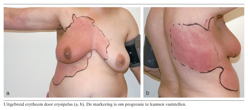 Een jaar na excisiebiopsie en okselklierdissectie rechts wegens een mammacarcinoom presenteerde een 60-jarige vrouw zich met sinds een dag bestaande pijnlijke roodheid van haar rechter borst en thoraxwand. Bij onderzoek was er algehele malaise en bedroeg de lichaamstemperatuur 40,1°C. Er was een pijnlijke, scherp begrensde roodheid op de plaats van de klachten (figuur). Er waren geen aanwijzingen voor abcesvorming of subcutaan emfyseem. Op de rechter bovenarm werden kleine huidafwijkingen gezien zonder lymfangitis. Bloedonderzoek gaf als uitslagen: leukocyten: 10,1 × 109/l; C-reactieve proteïne: 213 mg/l; glucose: 5,9 mmol/l. Onder de diagnose ‘erysipelas na eerdere borstsparende operatie’…