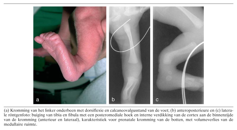 Een meisje werd in stuitligging geboren door middel van een primaire sectio, bij een amenorroeduur van 31 weken. Direct post partum werd een posteromediale kromming van het linker onderbeen opgemerkt, in combinatie met dorsiflexie en calcaneovalgusstand van de linker voet (figuur a). Op grond van het klinisch beeld en röntgenfoto's, die een posteromediale kromming van de tibia en fibula toonden (zie figuur b en c), luidde de diagnose ‘posterior bowing’ (achterwaartse kromming) van de tibia en fibula. Er was geen fractuur of pseudo-artrose zichtbaar op de foto's. De behandeling bestond uit het passief bewegen van de…