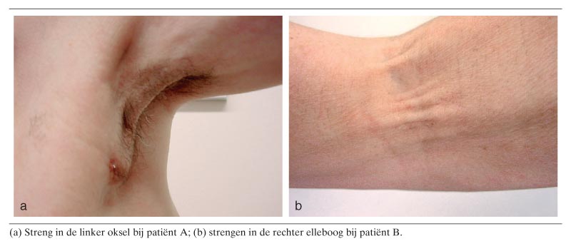 Twee vrouwen van respectievelijk 49 en 54 jaar werden wegens een recent vastgesteld mammacarcinoom borstsparend behandeld. Patiënt A onderging een schildwachtklieringreep links. Vóór het begin van de bestralingen kwam zij terug wegens een pijnlijke streng in de oksel die leidde tot een beperkte abductie van de schouder (figuur a). Zij werd fysiotherapeutisch behandeld en controle na 3 maanden toonde dat de streng praktisch verdwenen was, met herstel van de schouderfunctie. Patiënt B kreeg enkele weken na een complete okselklierdissectie rechts strengen in de oksel, met bovendien enkele strengen in de elleboogplooi (zie figuur b). Naast een…
