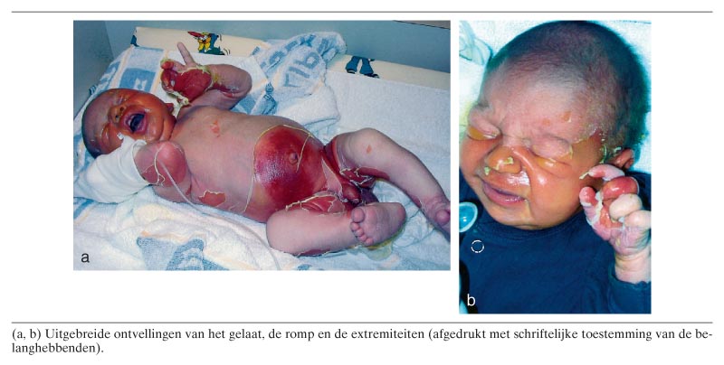 Een jongen van 6 dagen werd verwezen wegens subfebriele lichaamstemperatuur en progressieve huidafwijkingen. Bij zijn 2-jarige zusje op de crèche heerste impetigo. Bij lichamelijk onderzoek werd een pijnlijk, matig ziek kind gezien met een temperatuur van 38,2°C. De huid was grotendeels erythemateus en vertoonde slappe bullae gevuld met troebel vocht en daarnaast uitgebreide erosieve, nattende laesies. Van de naast de laesies gelegen huidgedeelten kon de epidermis gemakkelijk van de onderlaag afgeschoven worden, het verschijnsel van Nikolsky (figuur). Het slijmvlies van de mond was intact. 24 h na opname was epidermolyse over vrijwel het gehele lichaam opgetreden. Nadat…