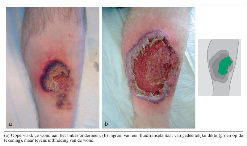 Een 34-jarige man meldde zich op de polikliniek Heelkunde in verband met een sinds twee maanden bestaand defect op het linker onderbeen, volgens de patiënt ontstaan nadat hij door een hond was gebeten. Bij lichamelijk onderzoek werd een ulcus gezien van 8 bij 8 cm (figuur a). Aanvullend röntgenonderzoek toonde geen aanwijzingen voor osteomyelitis. Uit het ulcus werd Staphylococcus aureus gekweekt, met een niet-afwijkend gevoeligheidsspectrum. Oppervlakkige chirurgische necrotomie en behandeling met hydrocolloïden hadden goed effect, zodat 3 weken na het eerste polikliniekbezoek een huidtransplantaat van gedeeltelijke dikte kon worden aangebracht. Het transplantaat groeide volledig in, maar buiten…