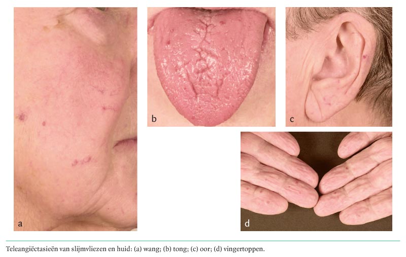 Een 81-jarige vrouw kwam op het spoedspreekuur met de melding dat ze sinds een week ’s morgens wakker werd met een mond vol bloedstolsels. Ook gedurende de dag gebeurde het vaak dat zij bloed in de mond proefde, door verlies van helderrood bloed. Zij was bekend wegens frequente neusbloedingen, welke veelal verholpen werden door elektrocoagulatie. Bij kno-onderzoek werd een alerte vrouw gezien met aan gelaat en handen multipele duidelijke teleangiëctasieën (figuur). Bij inspectie van de mondholte werden op de tongrug eveneens enkele kleine vasculaire malformaties gezien, waarvan sommige bij aanraking…
