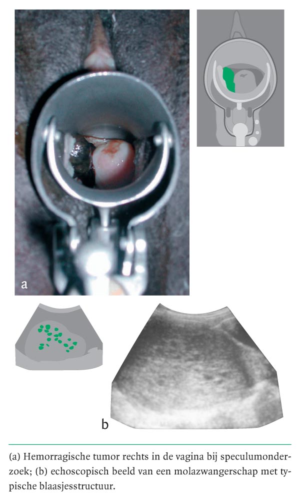 Een 19-jarige primigravida presenteerde zich op de eerstehulpafdeling met vaginaal bloedverlies bij een amenorroeduur van ongeveer 4 maanden en een positieve zwangerschapstestuitslag. Bij lichamelijk onderzoek werd een niet-bleke vrouw gezien die een gezonde indruk maakte; de fundushoogte was conform 14 weken zwangerschap. Speculumonderzoek toonde een hemorragische tumor met een diameter van 2 × 3 × 3 cm rechts in de vagina (figuur a). Differentiaaldiagnostisch werd gedacht aan een traumatische laesie met mogelijk geïnduceerde abortus, een hemorragische poliep of een vaginaal neoplasma. Bij abdominale echografie werd een typische blaasjesstructuur gezien, passend bij een mola hydatidosa (zie figuur b…