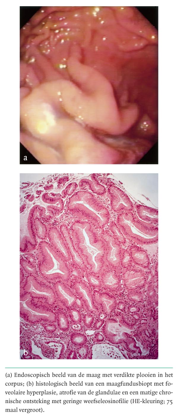 Een 7-jarige jongen werd wegens buikpijn, koorts, gewichtstoename en oedeem naar het ziekenhuis gebracht. Lichamelijk onderzoek toonde behoudens oedeem van scrotum, buik en benen geen afwijkingen. Het bloedonderzoek liet een hypoalbuminemie (16 g/l) zien zonder proteïnurie. De hoeveelheid ?1-antitrypsine in de feces was toegenomen (31,9 mg/g), passend bij een ‘protein-losing’ gastro-enteropathie. De buik was bij echografie niet afwijkend. Bij verdere diagnostiek van de protein-losing gastro-enteropathie werd endoscopisch onderzoek verricht. In het corpus van de maag werden grove, verdikte plooien (figuur a) met focale erosieve laesies en fibrineus beslag aangetroffen. Duodenum en colon waren endoscopisch en…