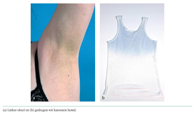 Een 56-jarige vrouw klaagde over lichtblauwe verkleuring van katoenen nacht- en onderkleding, met name van het bovenste derde deel daarvan. Zij vertelde door een hogere omgevingstemperatuur en stress tijdens haar bezigheden nu meer te transpireren dan vroeger. Zij gebruikte geen medicijnen en geen vitaminen, mineralen of andere voedingssupplementen. Bij onderzoek was er een geelgroene verkleuring van de oksels van patiënte zichtbaar (figuur a). Haar hemd toonde inderdaad een lichtblauwe verkleuring, voornamelijk aan de bovenzijde (zie figuur b). Bij microbiologisch onderzoek werd geen groei van chromogene bacteriën gezien. De bevindingen wezen op apocriene chromhidrose, waarbij gekleurd…