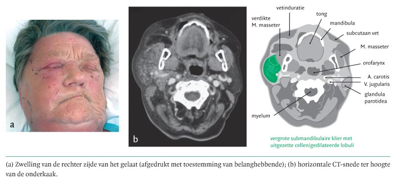 Collegae Van Nes en De Jong (2005:877) beschrijven een oudere vrouw met diabetes mellitus die een operatie onderging. Daarna kreeg zij een snel groeiende zwelling van het gelaat. Deze zwelling is op de foto van het gelaat en op de CT-scan te zien en blijkt lateraal van de mandibula te liggen. Een zwelling in dit gebied gaat eigenlijk altijd uit van de glandula parotidea en niet van de glandula submandibularis, die door fascie onder de mandibula wordt gehouden.