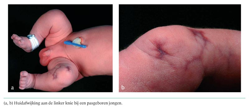 Tijdens routinematig lichamelijk onderzoek bij een pasgeboren jongetje werd een huidafwijking op het linker been gevonden. Patiënt was het tweede kind van niet-consanguïene Nederlandse ouders en was aterm geboren na een ongecompliceerde zwangerschap en bevalling. Op de mediale en ventrale zijde van de linker knie werd een persisterende, reticulaire, paarse huidafwijking gezien met geringe atrofie en prominente onderliggende bloedvaten (figuur a en b). Er was geen verschil in diameter of lengte tussen de beide benen en bij aanvullend lichamelijk onderzoek werden geen verdere afwijkingen gevonden. Dit klinische beeld past bij cutis marmorata teleangiectatica congenita, ook wel het…