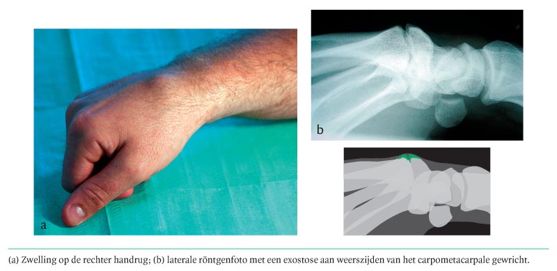Een man van 29 jaar werd gezien wegens een pijnlijke zwelling op de rechter handrug sinds enige weken (figuur a). Bij palpatie werd een ganglion carpi dorsale overwogen. De zwelling voelde opvallend vast aan. Met naaldaspiratie werd een heldere, geleiachtige vloeistof verkregen. Een röntgenopname van de hand toonde een benige protuberantie aan de dorsale zijde van het carpometacarpale gewricht van de tweede en derde straal, met enkele calcificaties (zie figuur b). De diagnose luidde ‘carpale exostose’ (‘carpal boss’; ‘carpe bossu’). Gezien de geringe klachten werd vooralsnog een afwachtend beleid gevoerd. Een carpale exostose is een weinig…