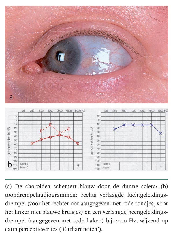 Een 51-jarige vrouw had sinds enkele jaren klachten over gehoorverlies rechts die haar hinderden bij het zingen in een koor. Zij had geen vertigo of tinnitus. Als kind had zij 5 keer een botbreuk. Toen zij 6 jaar oud was, stelde de kinderarts de diagnose ‘osteogenesis imperfecta’. De vader van patiënte was slechthorend en haar zoon had osteogenesis imperfecta zonder gehoorverlies. Bij onderzoek bemerkten wij blauwe sclerae (figuur a). Bij de stemvorkproef volgens Weber was er lateralisatie naar rechts, bij de proef volgens Rinne was die rechts negatief en links positief. Deze bevindingen wezen op een geleidingsverlies…