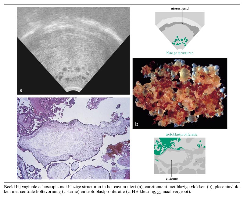Een 23-jarige zwangere vrouw werd bij een amenorroeduur van 10 2/7 weken opgenomen wegens heftige misselijkheid en gering bloedverlies per vaginam. Bij vaginaal echografisch onderzoek werden blazige structuren gezien (figuur). De concentratie van humaan choriongonadotrofine (hCG) was verhoogd (50.000 IU/l; normaal figuur). Microscopisch werden vergrote placentavlokken gezien met centrale holtevorming (cisternen) (zie de figuur). Rond de vlokken was trofoblastproliferatie aanwezig, deels circumferente.