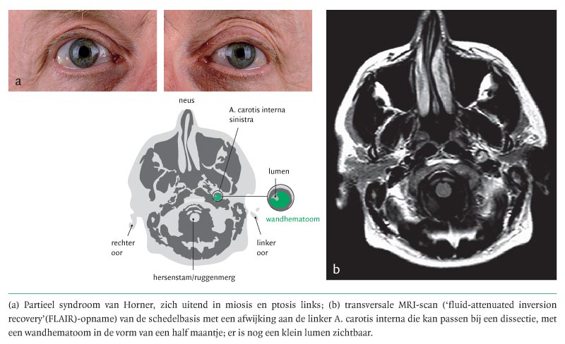 Een 56-jarige man werd ’s ochtends op zijn werk plotseling onwel, sprak wartaal en gebruikte verkeerde woorden. Hij kon de deur niet openen en liet voorwerpen uit zijn handen vallen. Soortgelijke klachten had hij nooit eerder gehad. Hij had 2 weken tevoren last gekregen van hoofdpijn links temporaal en hij had tevens een kleinere pupil links opgemerkt. Hij was door zijn huisarts behandeld met ibuprofen. De recente voorgeschiedenis vermeldde overigens geen halstrauma. Bij neurologisch onderzoek werden een (partieel) syndroom van Horner links (figuur a), een gemengde dysfasie en een dyspraxie gevonden. Tevens had patiënt een hypesthesie aan…