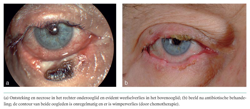Een 64-jarige man werd naar de polikliniek Oogheelkunde verwezen met sinds 1 week conjunctivitis van het rechter oog. De patiënt was bekend wegens een kleincellig anaplastisch bronchuscarcinoom met levermetastasen en een tumorpositieve supraclaviculaire lymfklier. Hij kreeg palliatieve chemotherapie. De eerste chemokuur was 2 weken eerder beëindigd. Uit het laboratoriumonderzoek bleek dat de fase van leukopenie inmiddels voorbij was: het leukocytenaantal was 18,4 × 109/l; een week eerder was het nog 0,4 × 109/l. Bij onderzoek bleek dat de contour van zowel het boven- als het onderooglid door necrose was aangetast (figuur). Ook was…