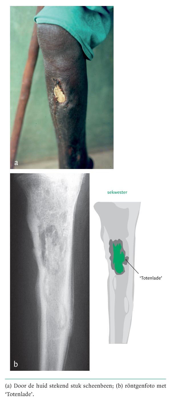 Een 55-jarige man werd gezien op de polikliniek van een ruraal ziekenhuis in Afrika. Hij had al jaren last van een pussende wond op het rechter scheenbeen. Geleidelijk was er een verharding opgetreden en uiteindelijk was er duidelijk bot van buitenaf waarneembaar (figuur a). Op de röntgenfoto waren een groot sekwester en osteomyelitis te zien (zie figuur b). Het sekwester was voor twee derde gelegen in een nieuwgevormd kapsel van beenweefsel, een zogenaamde ‘Totenlade’. Het andere deel van het sekwester perforeerde de huid. Het sekwester zat stevig vast, maar kon in stukken verwijderd worden. Na een…