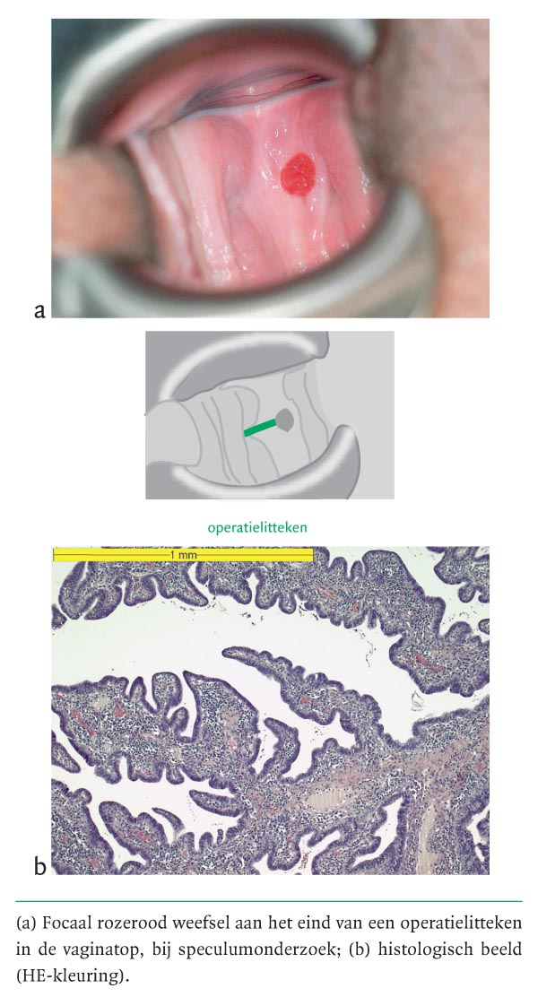 Een 45-jarige vrouw presenteerde zich met sinds 5 dagen bestaande zeurende pijn links in de onderbuik. Haar voorgeschiedenis vermeldde een abdominale hysterectomie 3 jaar eerder. Bij onderzoek zagen wij een matig zieke vrouw met drukpijn links in de onderbuik. Speculumonderzoek toonde ter plaatse van de vaginatop een scherp begrensd, afgerond gebied met rozerood granulatieweefsel en een diameter van circa 0,5 cm, lijkend op het fimbriële uiteinde van de tuba uterina (figuur a). Er werd een uitstrijkje gemaakt voor pap-onderzoek en er werden biopten uit het gebied genomen. Bloedonderzoek toonde gestegen waarden van infectieparameters. Ondanks intraveneuze antibiotische therapie…