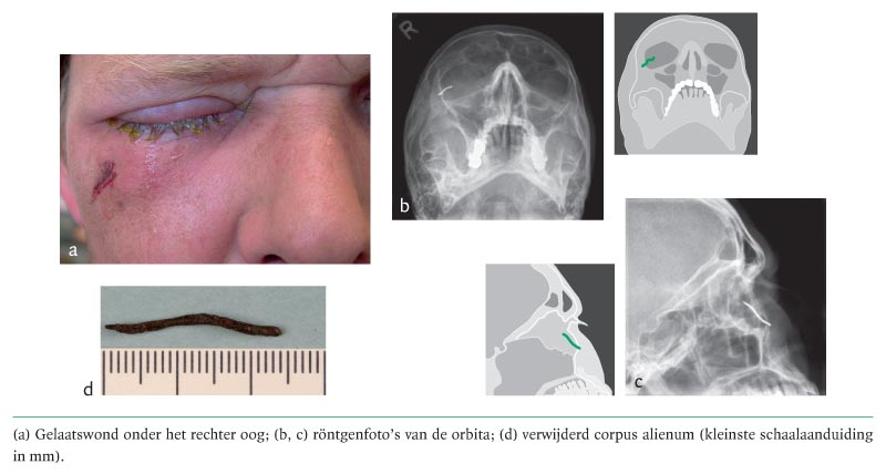 Een 44-jarige man had pijnklachten en visusdaling van het rechter oog sinds de vorige nacht. Het rechter oog had gezwollen oogleden en er was mucopurulente afscheiding. De visus rechts was slechts lichtperceptie. De cornea was intact. De voorste oogkamer, met een niet-afwijkende diepte, toonde een forse ontstekingsreactie met cellen, eiwitlekkage en fibrine. De fundus was niet te beoordelen. De bewegingen van het oog waren gestoord: adductie was niet mogelijk. Opvallend was een kleine, pussende huidwond ter plaatse van het rechter zygoma (figuur a). Het linker oog was niet-afwijkend, met een visus van 1,0. Daags tevoren was de…