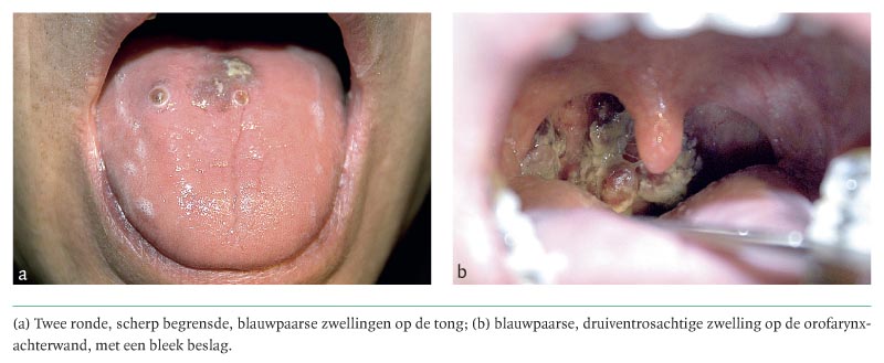 Een 40-jarige man had sinds 1 jaar klachten van recidiverende rinosinusitiden en heesheid. Zijn voorgeschiedenis vermeldde een adenotonsillectomie op 3-jarige leeftijd, allergische rinitis en een poststreptokokkenoligoartritis. Hij rookte 10 sigaretten per dag en dronk 5 eenheden alcohol per week. Als medicatie gebruikte hij budesonide-neusspray, desloratadine-tabletten en miconazol als orale gel. Bij intraorale inspectie werden halverwege de tong 2 ronde, scherp begrensde, blauwpaarse zwellingen gezien met een diameter van circa 0,5 cm (figuur a). De rechter zijde van de orofarynxachterwand vertoonde een blauwpaarse, druiventrosachtige, tumoreuze zwelling (zie figuur b). Bij flexibele nasofaryngolaryngoscopie werd bovendien een blauwe poliepeuze…