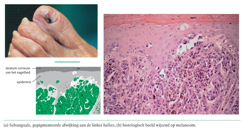Een 81-jarige vrouw werd verwezen vanwege een sedert 6 maanden bestaande afwijking aan de linker hallux, die was ontstaan nadat zij haar teen had gestoten. Bij lichamelijk onderzoek werd een subunguale, gepigmenteerde afwijking gezien (figuur a). Perifere pulsaties waren intact. In de linker lies werden geen pathologische lymfeklieren gepalpeerd. Omdat aan een maligniteit werd gedacht, vond partiële nagelextractie plaats en werden biopten genomen. Pathologisch onderzoek toonde een maligne acrolentigineus melanoom. Daarop werd een amputatie van de hallux verricht in combinatie met een schildwachtklierprocedure. De diagnose luidde: maligne melanoom in clark-stadium IV met een breslow-dikte van 3,7 mm (zie…