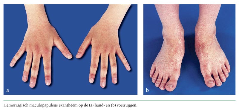 Een 12-jarig meisje werd gezien wegens een exantheem op haar handen en voeten. Zij was 5 dagen tevoren ziek geworden met hoofdpijn en koorts; 1 dag daarna ontstonden zwellingen in de hals. Op de 3e ziektedag kreeg zij een jeukende huiduitslag op de handen en voeten. De koorts was inmiddels verdwenen; zij had geen medicijnen gebruikt. Bij lichamelijk onderzoek zagen wij een meisje dat geen zieke indruk maakte. Zij had meerdere kleine lymfekliertjes in de hals. Op de handen en voeten, in het bijzonder op de hand- en voetruggen, bevonden zich vele papeltjes en petechiën (figuur). Hoofd…