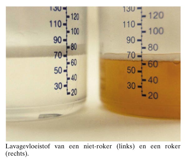Er is aangetoond dat bij ‘gezonde rokers’ het aantal alveolaire macrofagen, neutrofiele granulocyten en proïnflammatoire cytokinen zoals interleukine-8 is toegenomen ten opzichte van niet-rokers,3 terwijl er ook aanwijzingen zijn dat de chemische samenstelling van surfactans bij deze rokers veranderd is ten opzichte van niet-rokers.4 Het is onder veel onderzoekers al langer bekend dat de bruinzwarte verkleuring van bronchoalveolaire lavagevloeistof typisch wordt gezien bij rokers, maar literatuur hierover is ons niet bekend.