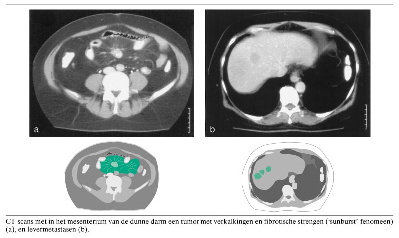Een 49-jarige vrouw kwam met onbegrepen klachten van braken en diarree op het spreekuur. Bij het lichamelijk onderzoek werden er geen afwijkingen gevonden. Er werd afgesproken laboratoriumonderzoek te doen en tevens echografie van het abdomen te verrichten. Bij het laatstgenoemde onderzoek werden verspreid in de lever kleinere en grote tumoren gezien en mogelijk een wekedelenmassa diep in het mesenterium. Vervolgens werd CT van het abdomen verricht. Daarbij werd een tumor in het mesenterium van de dunne darm gevonden, met verkalkingen (figuur). Dit beeld is typisch voor een carcinoïd; kenmerkend zijn de verkalkingen in de tumor en het zogenaamde ‘sunburst’-fenomeen: radiair verlopende, verdikte neurovasculaire bundels, die uitwaaieren naar de dunnedarmlissen en retractie van het mesenterium en de dunne darm veroorzaken. Tevens waren er multipele levermetastasen (zie de figuur). Differentiaaldiagnostisch kan gedacht worden aan adenocarcinoom, lymfoom, leiomyosarcoom en intraperitoneale metastasen. Carcinoïd is het meest voorkomende primaire neoplasma van de dunne darm (25). Het wordt wel een maligne neoplasma ‘in slowmotion’ genoemd en geeft in de eerste 5 jaar vaak nauwelijks klachten. Bij levermetastasen kan zich het carcinoïdsyndroom voordoen (met cutane ‘flushes’, diarree en bronchospasmen); dit wordt veroorzaakt doordat serotonine, dat door de tumor wordt geproduceerd en dat normaal in de lever wordt omgezet, direct in de circulatie komt. Patiënte onderging een aantal behandelingen met radioactief metajodobenzylguanidine, waarmee het proces bij de laatste follow-up al enkele jaren stabiel was.