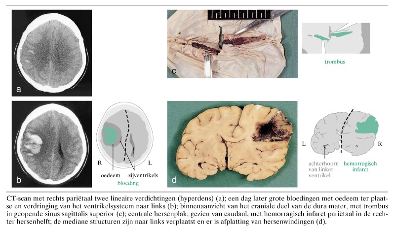 Een vrouw van 28 jaar kreeg na een probleemloze zwangerschap een gezonde dochter. Zes dagen na de bevalling ontstonden toenemende hoofdpijn, apathie en een gestoord gevoel van de linker arm. De dag nadien kreeg patiënte 's ochtends tijdens het douchen een epileptische aanval. Op de afdeling Spoedeisende Hulp was zij somnolent en kwam ze moeilijk uit haar woorden. Op een spoed-CT-scan toonde het cerebrum hoog temporopariëtaal rechts twee lineaire hyperdense verdichtingen (figuur) met het beeld van bloedinkjes met omgevend oedeem. Ook was er enig gegeneraliseerd hersenoedeem. Dit alles paste bij een sinustrombose. Tijdens het onderzoek kreeg patiënte…
