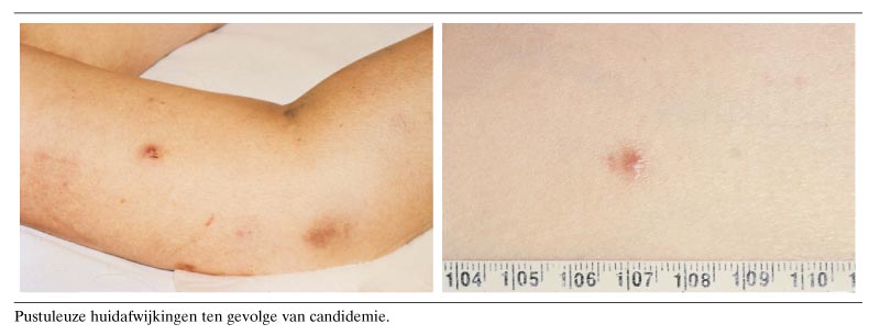 Een 35-jarige vrouw werd met intensieve chemotherapie behandeld wegens acute myeloïde leukemie. Tijdens een periode met ernstige granulocytopenie (granulocytenaantal 9/l; normaal 3,0 × 109/l) kreeg zij hoge koorts, die niet reageerde op antibiotische therapie. Op de derde dag verschenen duidelijk begrensde, pustuleuze huidafwijkingen op de armen (figuur). Een biopt uit een van die afwijkingen toonde gistcellen met hyfen. De waarschijnlijkheidsdiagnose luidde ‘candidemie met strooihaarden’. In fundo werden geen haarden gezien. Patiënte kreeg parenteraal amfotericine B toegediend. Twee dagen later bleek inderdaad de bloedkweek positief voor Candida albicans. Patiënte overleed enkele dagen later aan de…