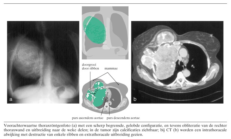 Een 55-jarige vrouw werd na een geringe verkoudheid erg dyspnoïsch, met axillaire pijn bij het hoesten. Verder voelde zij zich niet ziek. Zij vertelde al circa 30 jaar een kleine zwelling te hebben op de thoraxwand. Bij lichamelijk onderzoek werd een grote zwelling bij het rechter sleutelbeen gepalpeerd met axillaire venectasieën. Op de thoraxröntgenfoto was een scherp begrensde, gelobde configuratie zichtbaar, met obliteratie van de rechter thoraxwand, calcificaties en uitbreiding naar de weke delen (figuur). Bij CT werd een grote intrathoracale afwijking gezien, 20 cm bij 19 cm, met wisselende densiteiten, uitbreiding naar de weke delen en…
